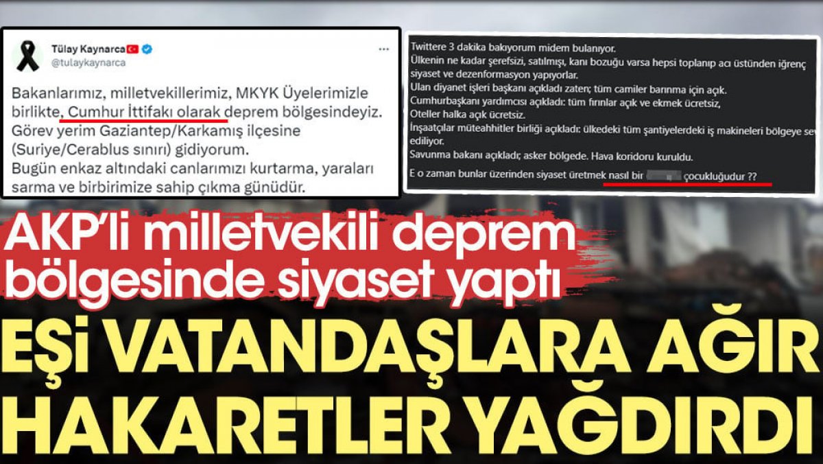 Deprem bölgesinde siyaset yapan AKP’li milletvekili Tülay Kaynarca’nın eşi Yavuz Kaynarca yaşanan felaket üzerinden vatandaşlara ağıza alınmayacak hakaretler yağdırdı.