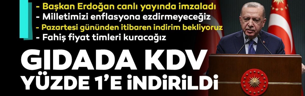 Başkan Recep Tayyip Erdoğan Türkiye Ekonomi Modeli Yeni Adımlar ve Enflasyon tedbirleri tanıtım toplantısında açıklamalarda bulundu. Vatandaşlarımızı yüksek enflasyona ezdirmeyeceğiz diyen Başkan Erdoğan, vatandaşa bir de müjde verdi. Başkan Erdoğan, temel gıda ürünlerinde uygulanan yüzde 8lik KDVnin yüzde 1e düştüğünü açıkladı.