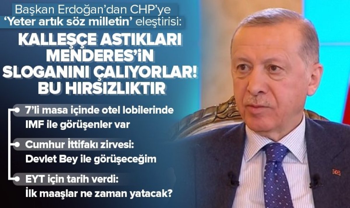 Başkan Recep Tayyip Erdoğan, Türkiye ve dünya gündemine dair son gelişmeleri TRT'de değerlendirdi. Başkan Erdoğan, CHP'nin 'Yeter söz milletin' sloganını kullanmasına sert ifadelerle yüklenerek, "Kalleşçe astıkları Menderes'in şimdi de sloganını çalıyorlar, bunun adı hırsızlıktır." dedi. Diğer yandan Türkiye’nin atılımlarına değinen Başkan Erdoğan, "Türkiye Yüzyılı, Türkiye'nin son dönemde elde ettiği güç ve birikimle dünyanın en önde gelen ülkelerinden biri olacağı dönemin adıdır." cümlesini kullandı. 2023 Cumhurbaşkanlığı seçimlerinde kendisi için “Bir daha adaylıkta engel yok" ifadelerine yer veren Başkan Erdoğan, 6’lı koalisyona “Sandıktan umudunu kesenlerin suyu bulandırma çabasıdır" sözleriyle yanıt verdi. Eski Türkiye özlemi içinde olan muhalefetin mutabakat metnine de değinen Başkan Erdoğan, "7'li masa içinde, otel lobilerinde IMF ile görüşenler var." açıklamasını yaptı. Ayrıca Başkan Erdoğan, milyonların merakla beklediği "EYT'de ilk maaşlar ne zaman yatar?" sorusuna yanıt verdi..