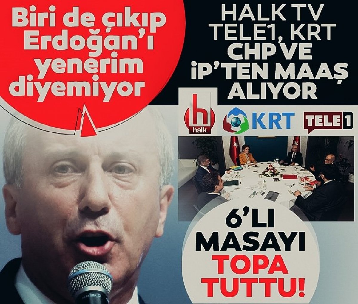 Memleket Partisi Genel Başkanı Muharrem İnce, 6lı İttifakı eleştirerek, “Şunu söyleyeyim, 6’sından biri çıkıp da ben bu Erdoğan’ı yenerim düşün peşime diyemiyor" dedi. Öte yandan CHP’ye yüklenen Muharrem İnce, “Halk TV, Tele 1, KRT, CHP’den ve İYİ Parti’den her ay düzenli maaş alıyor. Miktarlarını bile söylerim. Son zamları bilmiyorum ama. Bir de haber yaptıkları zaman maaşı keseriz diye tehdit ediyorlar, sonra bu ülkeye demokrasi getireceğiz diyorlar" dedi.