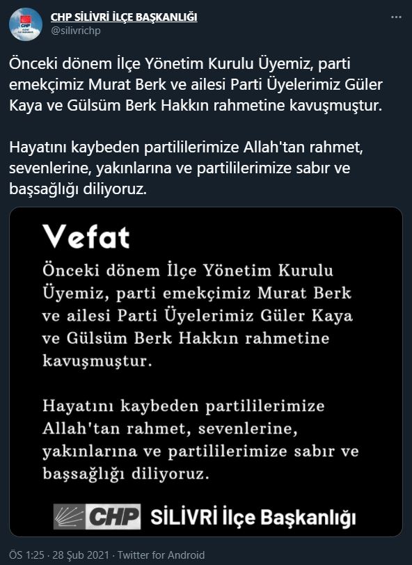CHP’den ise olayla ilgili herhangi bir açıklama yapılmadı. CHP Silivri İlçe Başkanlığı da başsağlığı mesajında olayın nedenine ilişkin herhangi bir açıklama yapmadı.