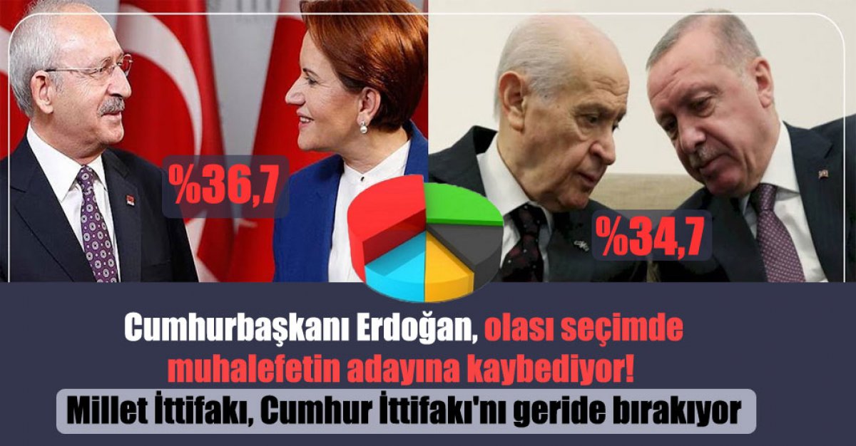 Cumhurbaşkanı Erdoğan, olası seçimde muhalefetin adayına kaybediyor; Millet İttifakı, Cumhur İttifakı'nı geride bırakıyor
