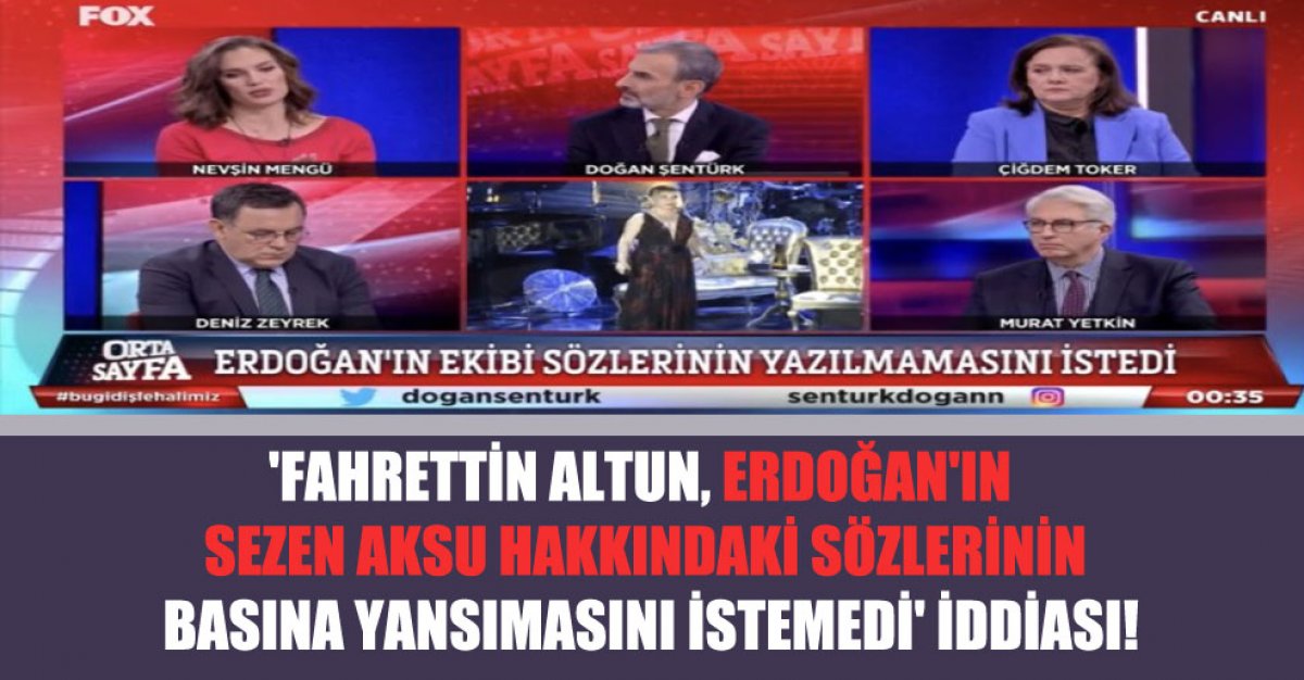 Gazeteci Nevşin Mengü, Cumhurbaşkanı Tayyip Erdoğan’ın şarkıcı Sezen Aksu’ya yönelik sözleriyle ilgili olarak, “Bana gelen bilgi, cami içinde Cumhurbaşkanı bu açıklamayı yaptığı sırada gazeteciler bunu duyuyorlar. Fakat Cumhurbaşkanlığı Basın Müşaviri geliyor 'arkadaşlar bunu yazmayın lütfen. Fahrettin bey de yazılmasını istemiyor’ diyor" ifadesini kullandı.