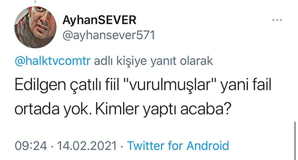 HALK TV'nin haberiyle ilgili Twitter hesabının altına yorum yazan sosyal medya kullanıcısı Ayhan Sever, "Edilgen çatılı fiil 'vurulmuşlar' yani fail ortada yok. Kimler yaptı acaba?" diye sordu. Aydın Aksoy ise "Kim vurmuş onu niye söylemiyorsunuz!" dedi.