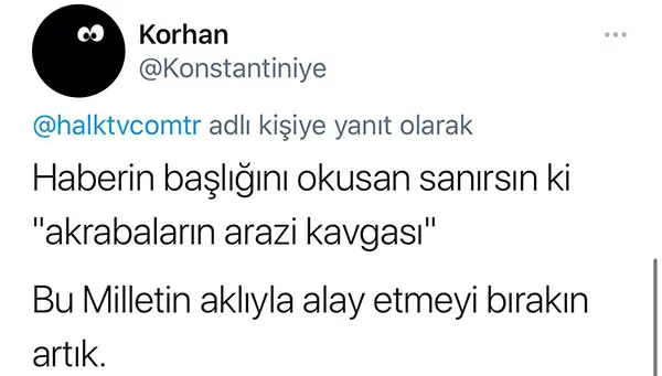Dr. Hüseyin, HALK TV'ye "PKK'lı hain ve katil köpekler tarafından infaz edildiler diyemiyorsunuz değil mi? PKK'nın siyasi ayağı ile stratejik ortaklık yapan ağababalarınız mı kızar yoksa ittifakınıza mı halel gelir vatan sizin için ne anlam ifade ediyor bir söyleyin hele..." dedi. Korhan ise HALK TV haberine "Haberin başlığını okusan sanırsın ki 'akrabaların arazi kavgası' Bu Milletin aklıyla alay etmeyi bırakın artık" ifadelerini kullandı.