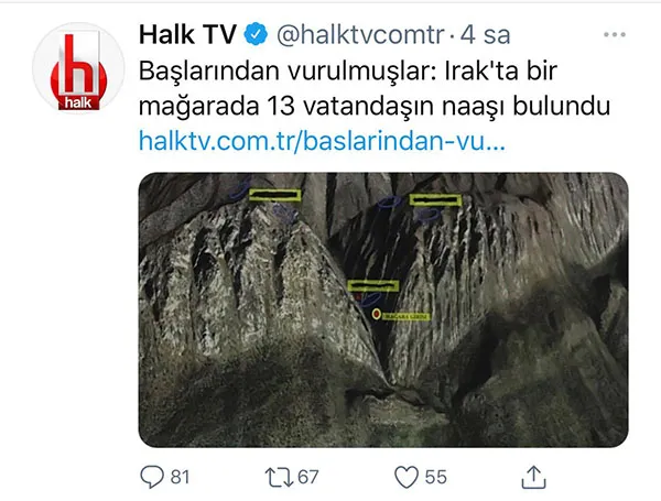 Terör örgütü PKK tarafından bir mağarada şehit edilen 13 vatandaşın başlarından vurularak şehit edildikleri hakkında Milli Savunma Bakanı Hulusi Akar'ın açıklamasını CHP yandaşı HALK TV terör örgütü PKK'yı başlığında vurgulamadan yayınladı. HALK TV internet sitesinde "Başlarından vurulmuşlar: Irak'ta bir mağarada 13 vatandaşın naaşı bulundu" başlığı yer alırken, Twitter hesabından da aynı başlıkla haberi sundu.