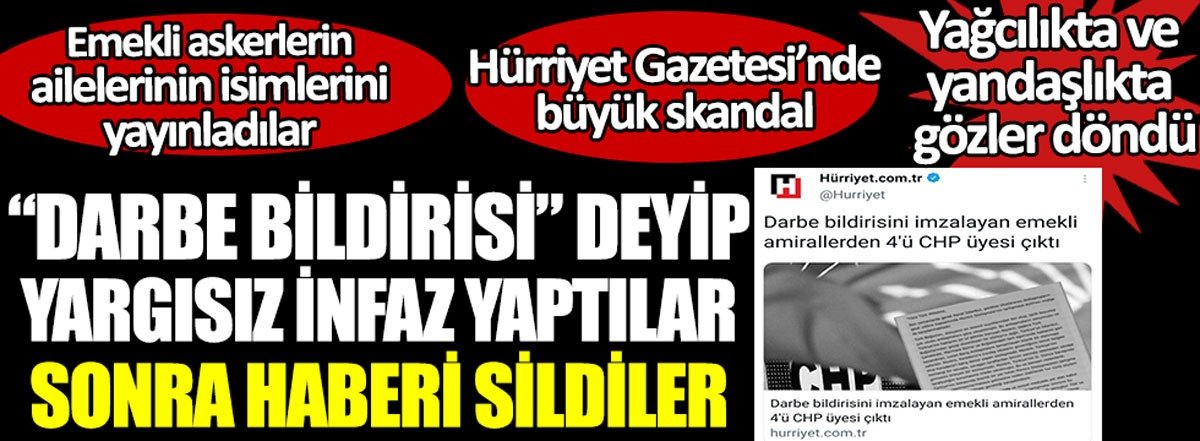 Hürriyet ilk yaptığı haberde “darbe bildirisini imzalayan emekli amirallerden 4’ü CHP üyesi çıktı” başlığını kullandı ve yakınlarının isimlerini verirken, daha sonra haberi güncelleyerek yakınlarının isimlerini kaldırdı. Söz konusu haber Twitter’da da paylaşıldıktan belli bir süre sonra kaldırıldı.