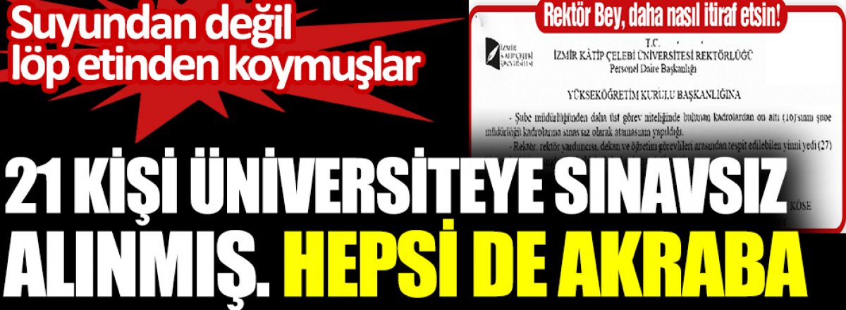 Katip Çelebi Üniversitesi'nde rektör, rektör yardımcısı, dekan ve öğretim görevlileri arasındaki 27 kişi birbiriyle akraba çıktı. CHP Milletvekili Mahir Polat “Binlerce vatandaşımız sınavlarda alın teri dökerken bu kadrolara birileri sınavsız geliyor. Kul hakkından bahsedenler, eş dost atamaları için kul hakkı yiyor” dedi.
