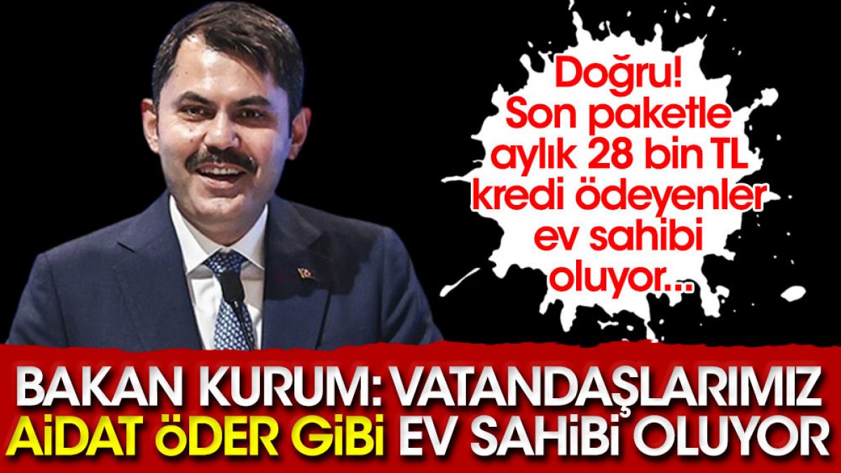 Murat Kurum: Vatandaşımız aidat öder gibi ev sahibi oluyor.Bir haber kanalı yayınına katılan Çevre ve Şehircilik Bakanı Murat Kurum, gündeme ilişkin değerlendirmelerde bulundu. Kurum, Vatandaşımız aidat öder gibi ev sahibi oluyor sözlerini kullandı.