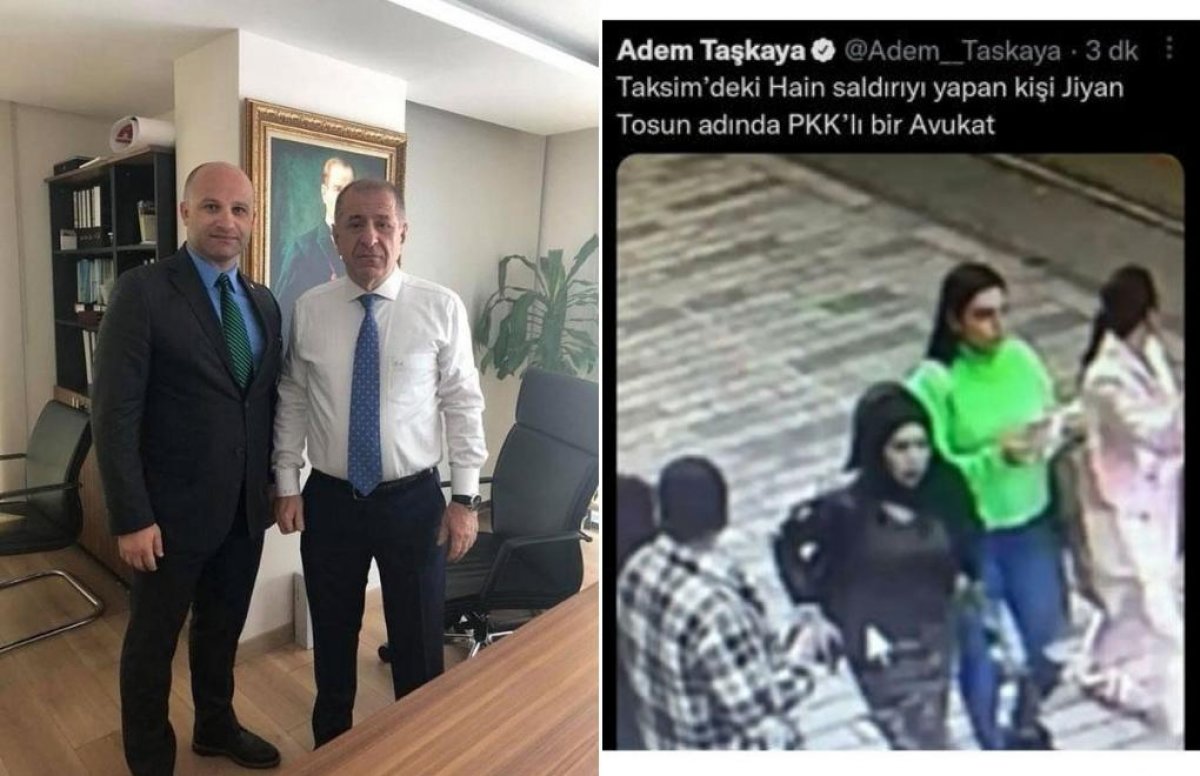 İstiklal Caddesi'nde 13 Kasım'da meydana gelen patlamanın ardından Zafer Partili Adem Taşkaya, Twitter'dan avukat Jiyan Tosun'u bombalı saldırının faili gibi gösterdi. Hedef gösterilen Jiyan Tosun, ölüm tehditleri almaya başladı. Tosun, o gece sabaha kadar adliyede bekledi ve savcılığa suç duyurusunda bulundu. Paylaşımını silen Adem Taşkaya ise "Telegram gruplarında dolaşıyordu ben de oradan görüp paylaştım. Yanlış olduğunu anlayıp silmek istedim, bant genişliği daraltılınca silemedim" savunması yaptı. Ertesi gün İnsan Hakları Derneği'nde bir basın toplantısı düzenleyen Jiyan Tosun, 16 yaşındaki yeğeninin ve yengesinin dahi ölüm tehditleri aldığını dile getirdi. |