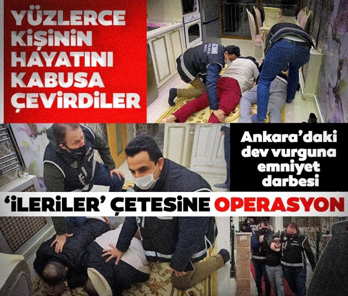 Ankara Cumhuriyet Başsavcılığınca yürütülen soruşturma kapsamında Mali Suçlarla Mücadele Şube Müdürlüğü ekipleri, 6 süren teknik ve fiziki takip sonrası, tefecilik ve nitelikli dolandırıcılık suçlarını işleyen liderliğini H.İ.'nin yaptığı "İleriler" suç örgütünün 35 üyesine yönelik 40 adrese eş zamanlı operasyon düzenlendi. İleriler suç örgütünün tefecilik ve nitelikli dolandırıcılık suçlarından toplam 13 milyon lira haksız kazanç sağladıkları ortaya çıktı.