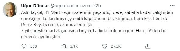 Dündar "Aslı Baykal, 31 Mart seçim zaferinin yaşandığı gece, sabaha kadar çalıştırdığı emekçileri kullanılmış eşya gibi kapı önüne bıraktığında, hem kızı, hem de Deniz Bey, benim gözümde bitmişti. 7 yıl süreyle markalaşmasına büyük katkıda bulunduğum Halk TV'den bu nedenle ayrılmıştım." açıklamasında bulundu.