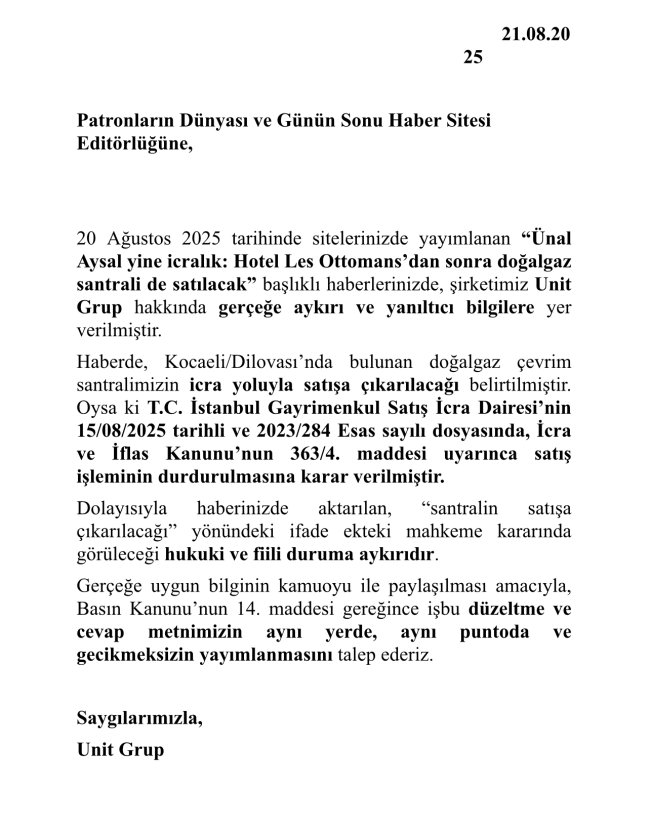 Dilovası’nda bulunan bir doğalgaz santrali icradan satışa çıkarıldı. 15 milyar lira değer biçilen santral, Galatasaray eski başkanlarından Ünal Aysal'a ait olduğu ortaya çıktı. Aysal geçtiğimiz günlerde de İstanbul’un en ikonik yapısı olan otelini Serdar Bilgili’ye kaptırmıştı.