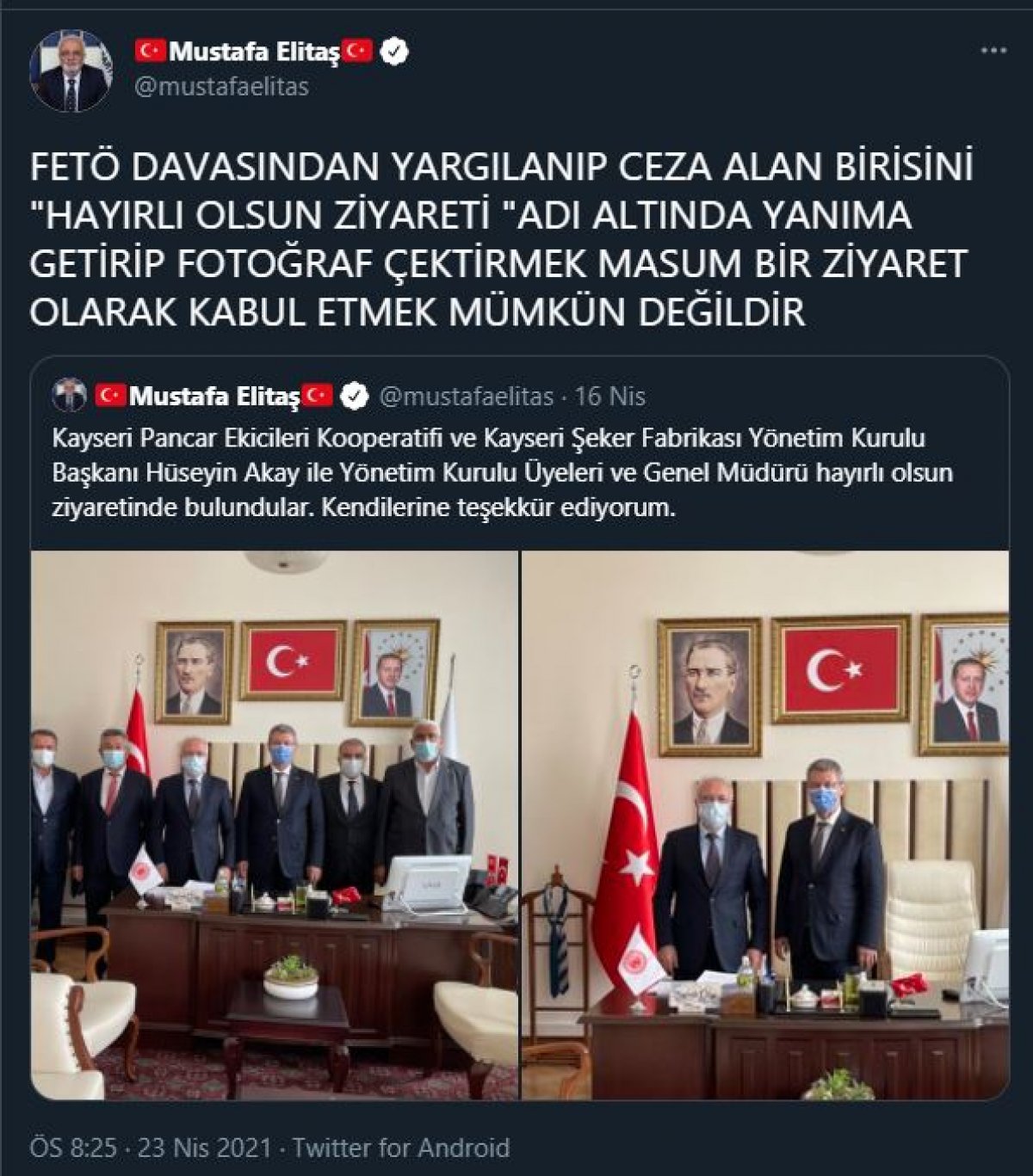 Sosyal medya hesabından apar topar bir açıklama yapan Elitaş, “FETÖ davasından yargılanıp ceza alan birisini ‘hayırlı olsun ziyareti’adı altında yanıma getirip fotoğraf çektirmek masum bir ziyaret olarak kabul etmek mümkün değildir” ifadelerini kullandı.